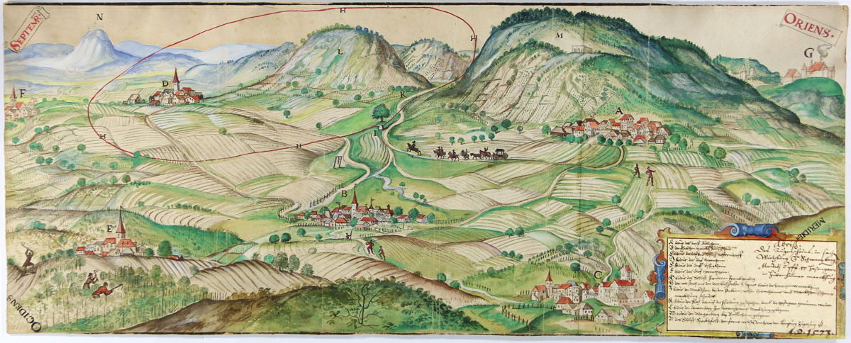 Älteste Abbildung des Ortes Seinsheim (Siehe mittig B) auf einem Riss aus dem Jahr 1573. (Staatsarchiv Würzburg, Würzburger Risse u. Pläne I/277) HLB
