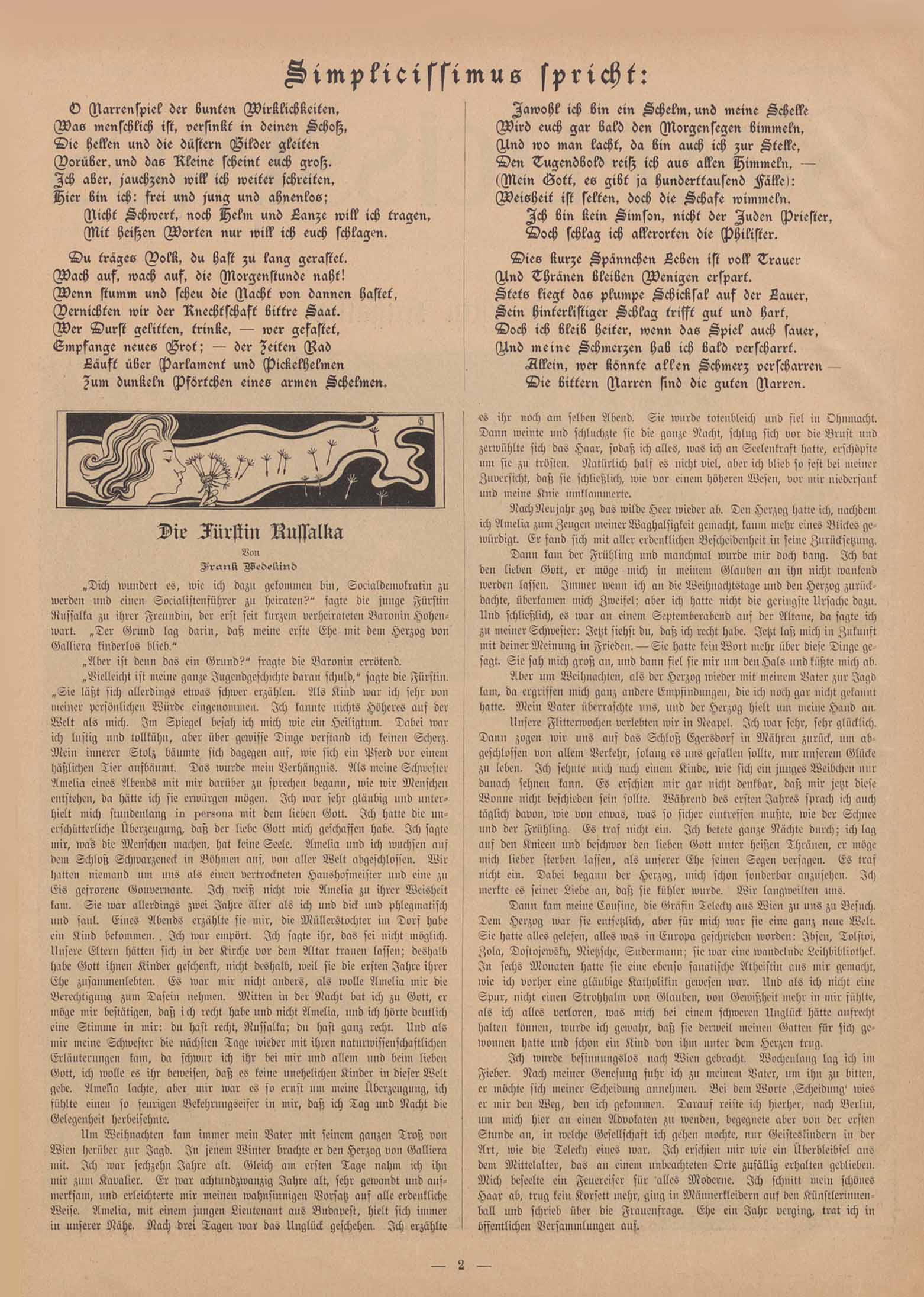 Auszug aus "Die Fürstin Russalka" von Frank Wedekind. (Simplicissimus Jg. 1, Nr. 1, 4.4.1896, 2) HLB
