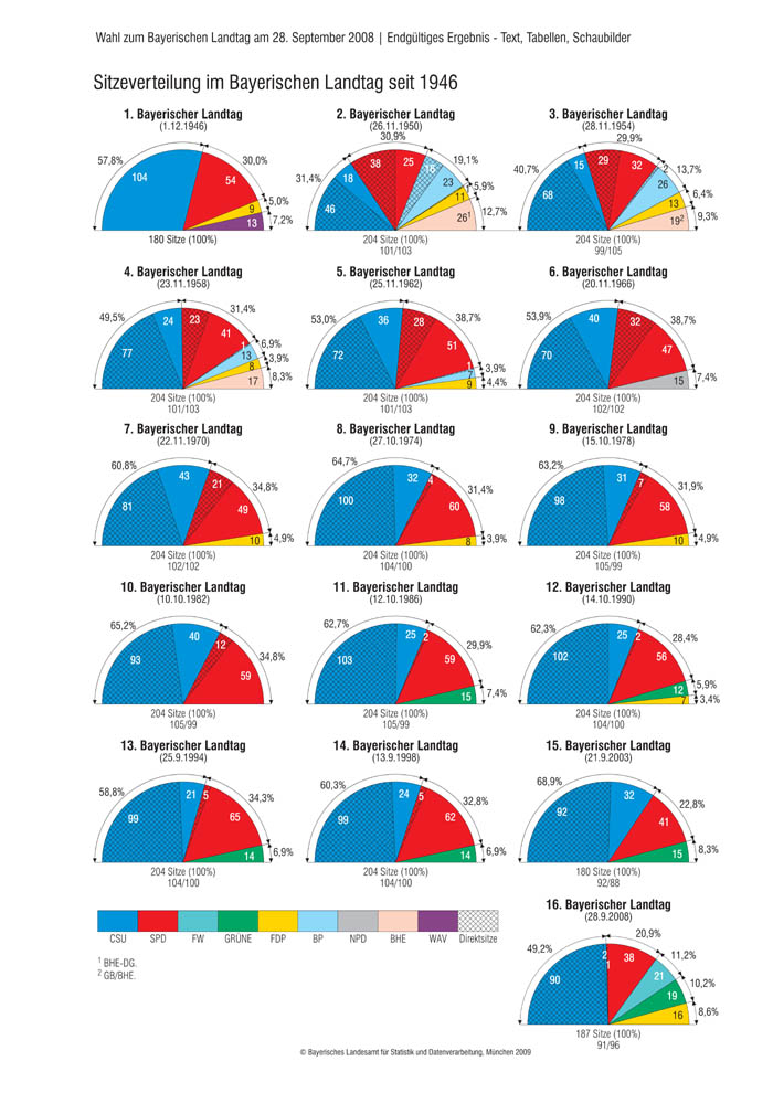 Sitzverteilung im Bayerischen Landtag seit 1946 (Quelle: Bayerisches Landesamt für Statistik und Datenverarbeitung, München 2009.)