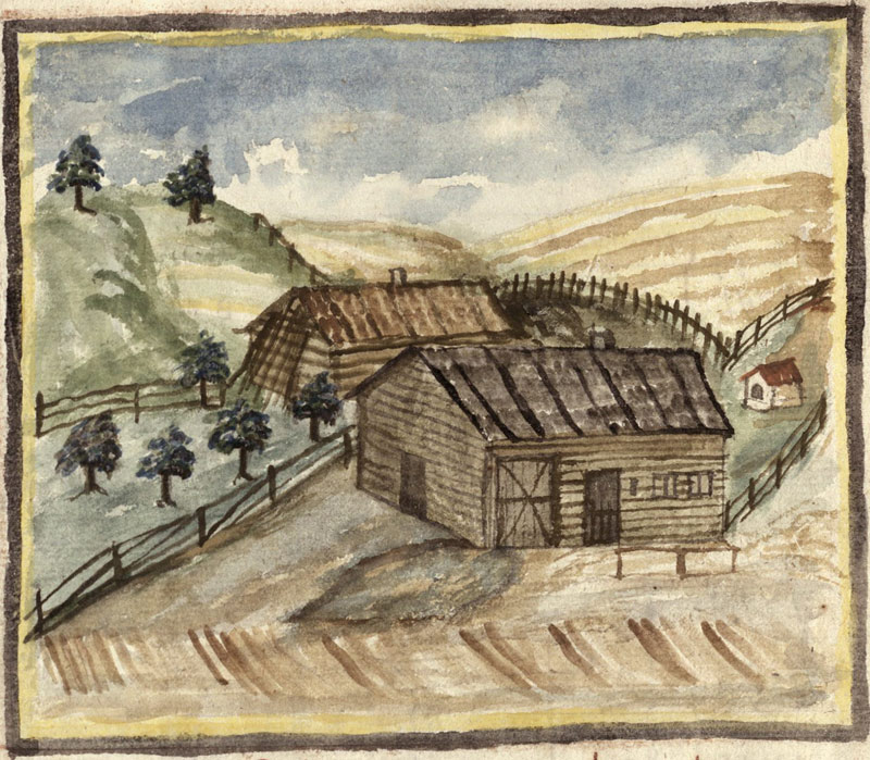 Das reine Bauerndorf als Ausnahmefall. Eines der vielen Bilder aus dem „Hausbuch“ des Martinsbucher Pfarrers Franz Xaver Prechtl von 1793 zeigt die Sölde des Zimmerers und dahinter ein Tagwerkerhaus. Abb. aus: Franz Xaver Prechtl: Ansichten aus dem Hausbuch der Pfarrei Martinsbuch. Martinsbuch 1793, Nr. 35, 261. (Bischöfliches Zentralarchiv Regensburg, Matrikel Martinsbuch Bd. 35, S. 261) HLB