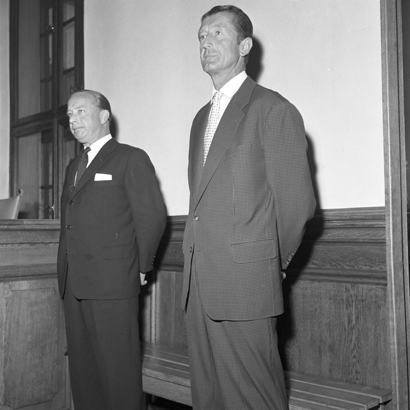 Werner Friedmann (1909-1969) und Siegfried Sommer(1914-1996) im Gerichtssaal des Münchner Justizpalastes bei einem Prozess wegen Kuppel 1960 (Bayerische Staatsbibliothek, Bildarchiv) Vom Eigentümer zur Verfügung gestellt.