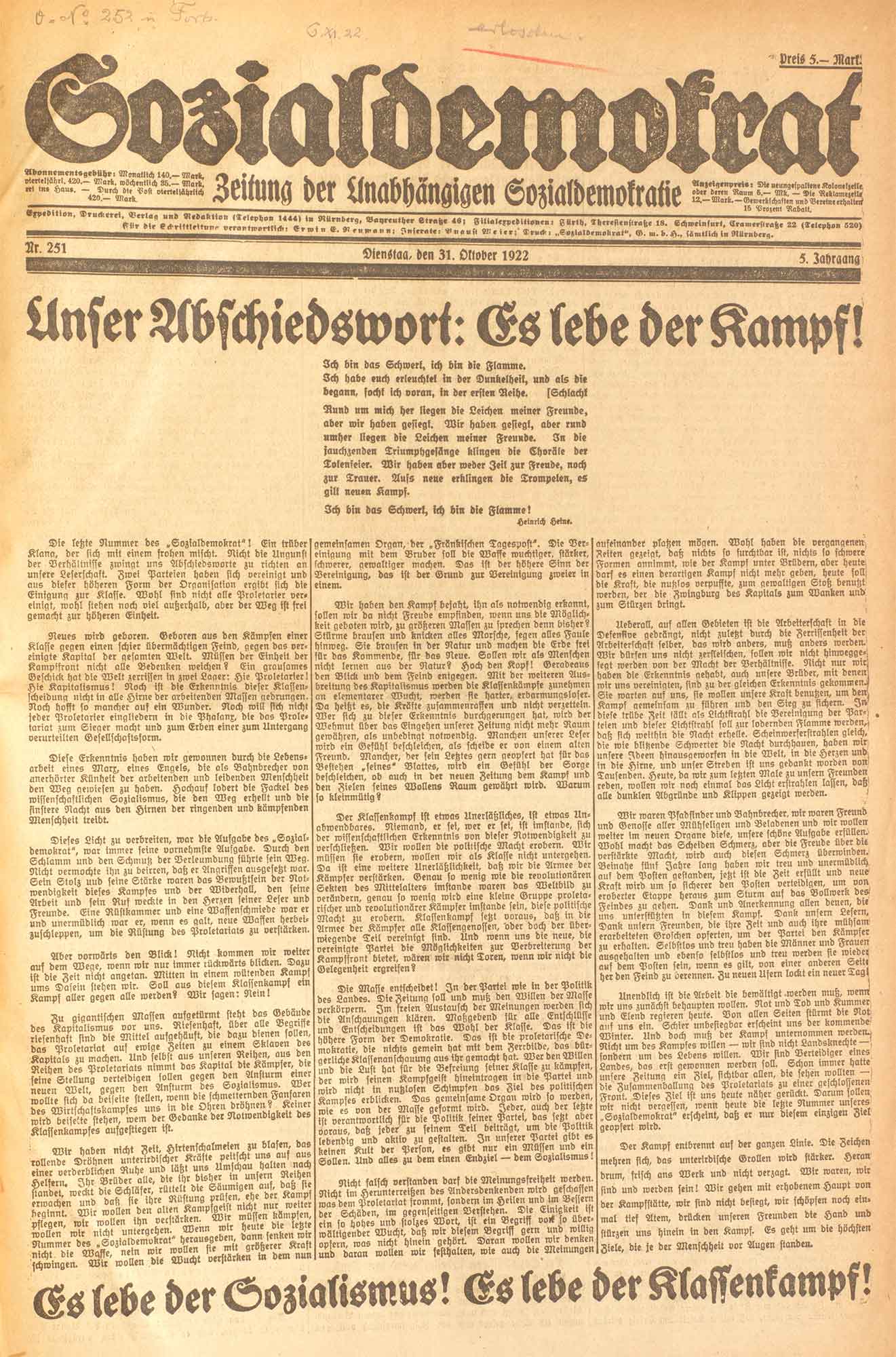 Letzte Ausgabe der bayerischen Parteizeitung der USPD vom 31.10.1922. Infolge der Wiedervereinigung der beiden Sozialdemokratischen Parteien stellt die Zeitung ihr Erscheinen ein. Titelblatt, Sozialdemokrat Nr. 251 (31.10.1922) (Bayerische Staatsbibliothek, 2 Eph.pol. 58 x-1922,7/10)