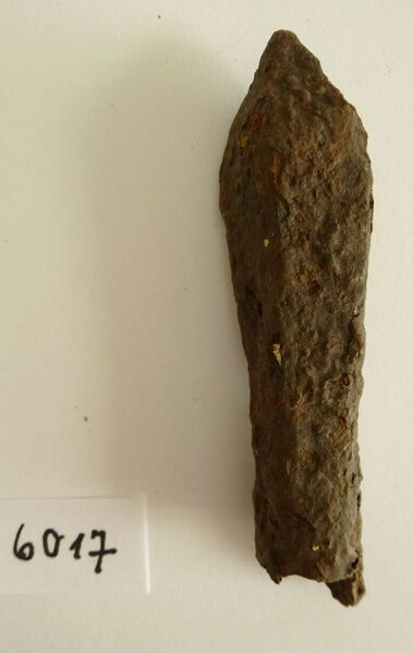 Spitze eines Armbrustbolzens aus der Schlacht bei Hiltersried. Der Bolzen wurde bis 1433 in der Oberpfalz aus Eisen geschmiedet. (Schwarzachtaler Heimatmuseum in Neunburg vorm Wald. Inventarnr. 6017) HLB