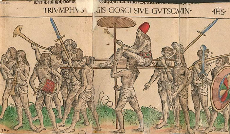 Holzschnitt aus Balthasar Springer, Die Merfart vn[d] erfarung nüwer Schiffung vnd Wege zu viln onerkanten Jnseln vnd Künigreichen von dem großmechtigen Portugalische[n] Kunig Emanuel Erforscht funden bestritten vnnd Jngenomen, [Oppenheim] 1509.