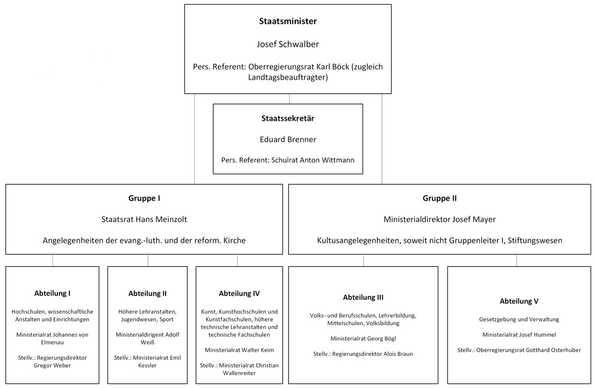 Geschäftsverteilung des Staatsministeriums für Unterricht und Kultus im Jahr 1954. (Graphik: Felix Lieb; Quelle: BayHStA, Minn 82178) HLB