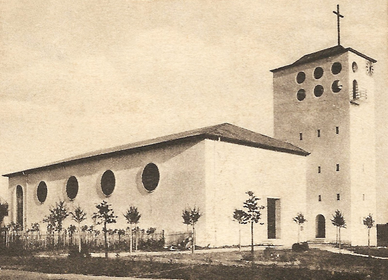 Hans Herkommer (1887-1956), St. Raphael in Großohrenbronn (Gde. Markt Dentlein, Lkr. Ansbach), um 1932. Nach Meinung des Baukunstausschusses passte der moderne Kirchenbau nicht in die fränkische Landschaft und die Pläne mussten mehrfach geändert werden. Trotz dieser Intervention zählt St. Raphael zu den modernsten Kirchen Bayerns zur Zeit der Weimarer Republik. (Foto: privat) HLB