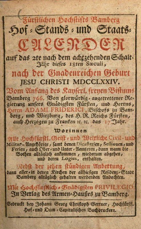 In den gedruckten Staatskalendern finden sich seit 1764 alle Amtsträger des Hochstifts Bamberg. Hier zusehen ist das Titelblatt des Kalenders von 1774. (Bayerische Staatsblbiothek, Bavar. 1262-1774)