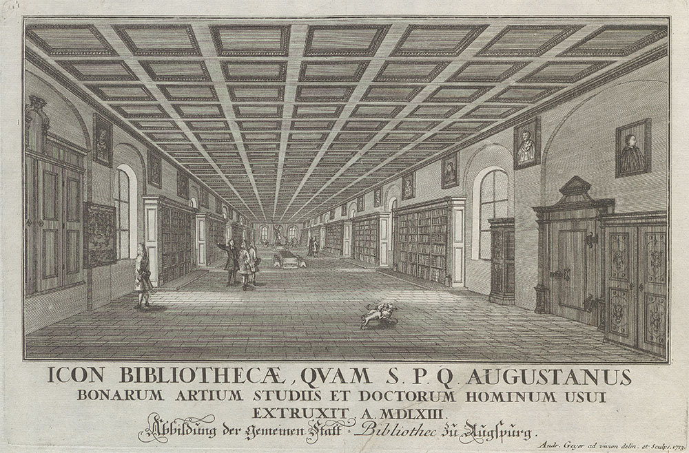 Oberer Bibliothekssaal der Augsburger Stadtbibliothek. Der Stich stammt von Andreas Geyer (gest. 1723) und ist die einzige erhaltene Innenansicht des alten Bibliotheksgebäudes. (Staats- und Stadtbibliothek Augsburg, Graph 23/38,2)