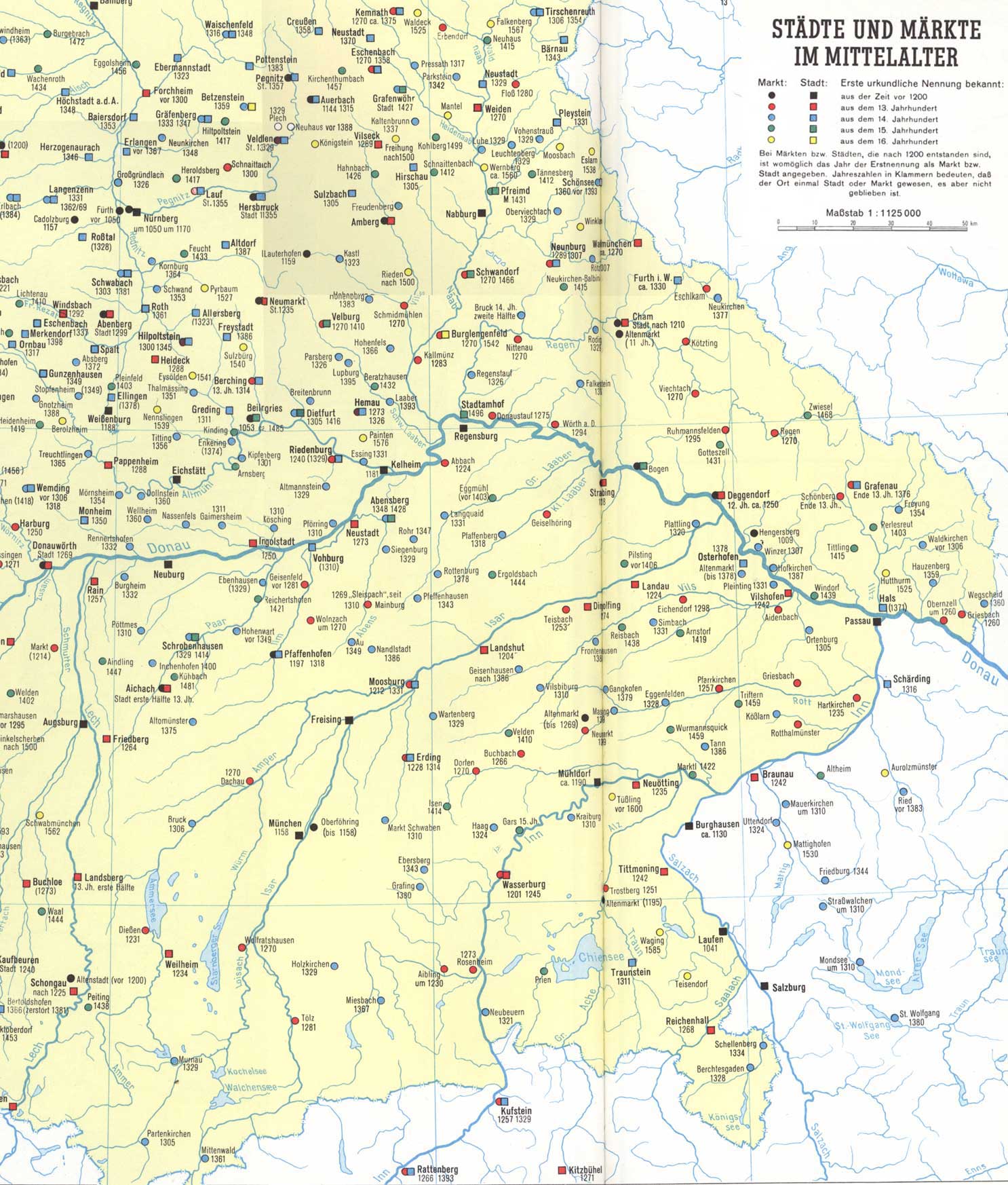 Städte und Märkte im Mittelalter in Altbayern. Abb. aus: Max Spindler/Gertrud Diepolder, Bayerischer Geschichtsatlas, München 1969, 22/23. (Bayerischer Schulbuchverlag) HLB