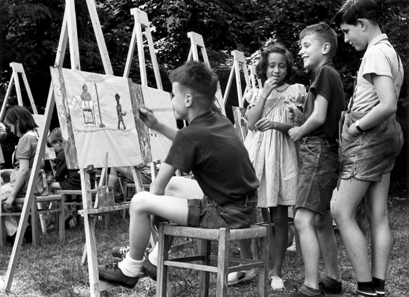 Neben der Bereitstellung von Kinder- und Jugendliteratur bot die Internationale Jugendbibliothek Kindern und Jugendlichen verschiedene Freizeitaktivitäten an. Malkurs um 1952. (Stiftung Internationale Jugendbibliothek, Foto: Hans Schürer) HLB