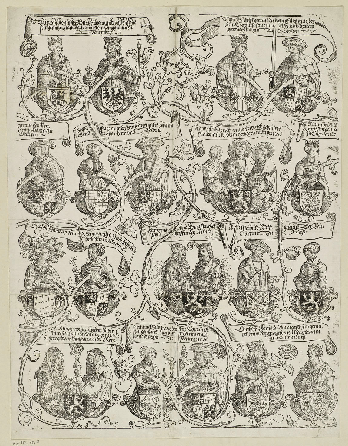 Stammbaum der wittelsbachischen Pfalzgrafen bei Rhein um 1530. Als Paar in der linken oberen Ecke sind dargestellt: "Ruprecht Römischer König und Pfalzgraf bei Rhein und Frau Katharina geborene Burggräfin zu Nürnberg" (Kunstsammlungen der Veste Coburg, VI, 429,102)
