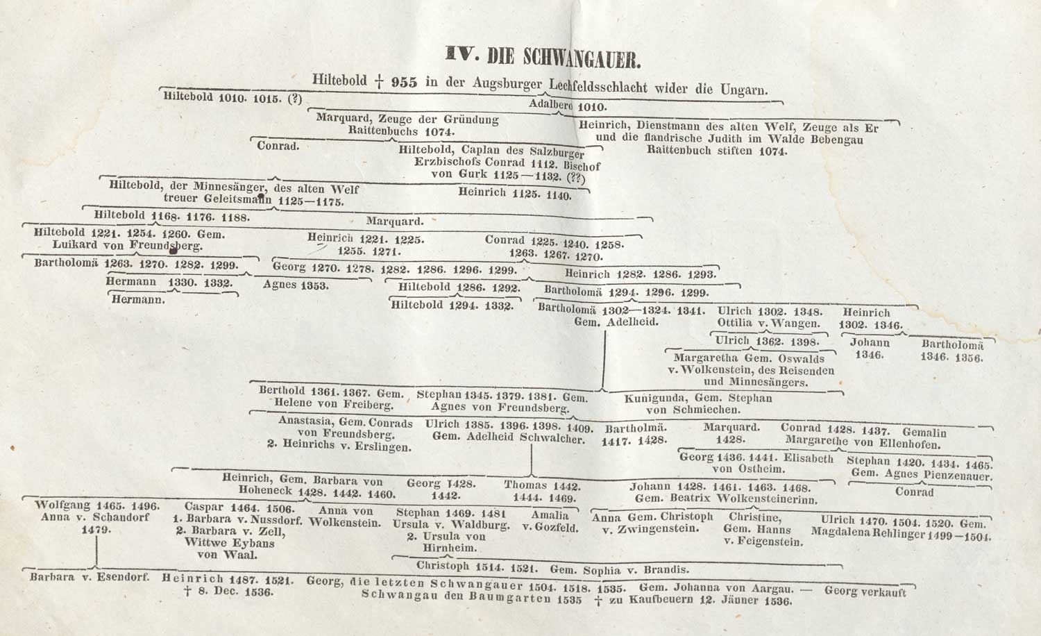Stammtafel der Herren von Schwangau. Abb. aus: Joseph von Hormayr, Die goldene Chronik von Hohenschwangau, der Burg der Welfen, der Hohenstauffen und der Scheyren, München 1842, Taf. IV. (Bayerische Staatsbibliothek, Res/4 Bavar. 986 f) HLB