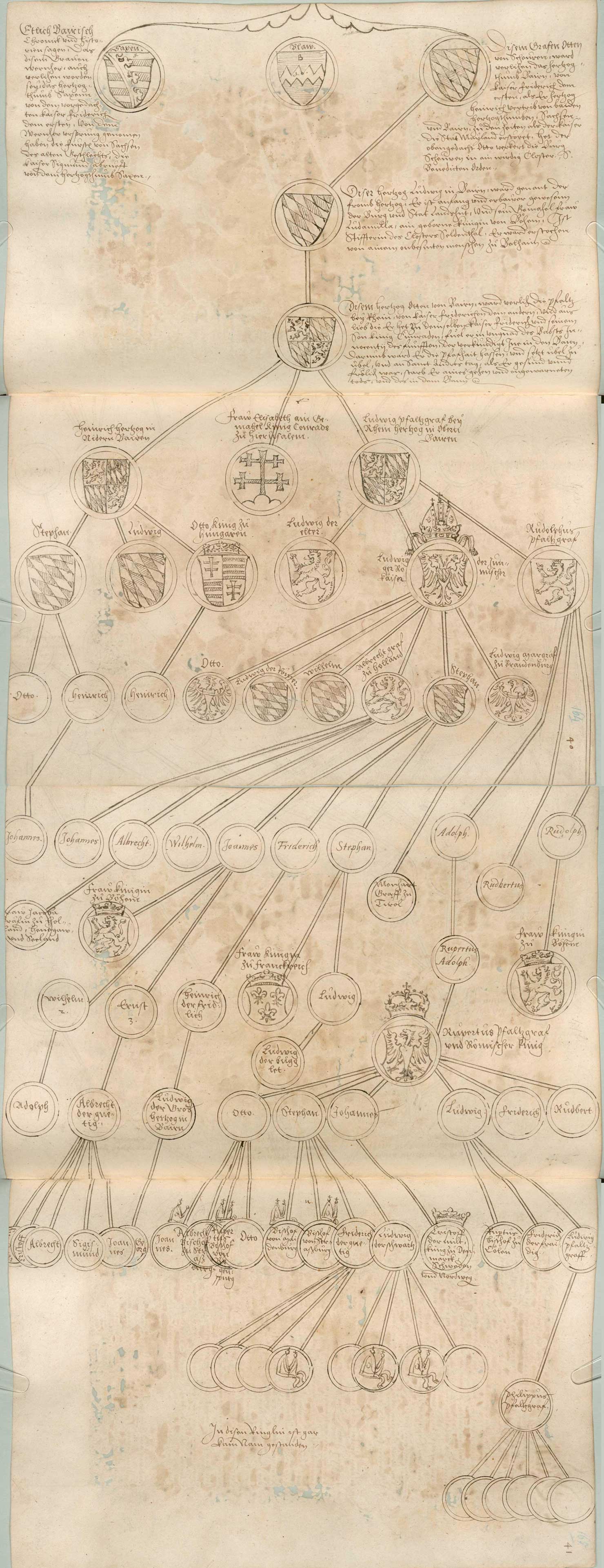 Stammtafel der Wittelsbacher aus der Bairischen Chronik des Hans Ebran von Wildenberg. Fotokollage mit korigierten Linien am unteren Rand von fol. 40r. Abb. aus: Hans Ebran von Wildenberg: Chronik von den Fürsten aus Bayern, um 1500. (Bayerische Staatsbibliothek Cgm 1557)