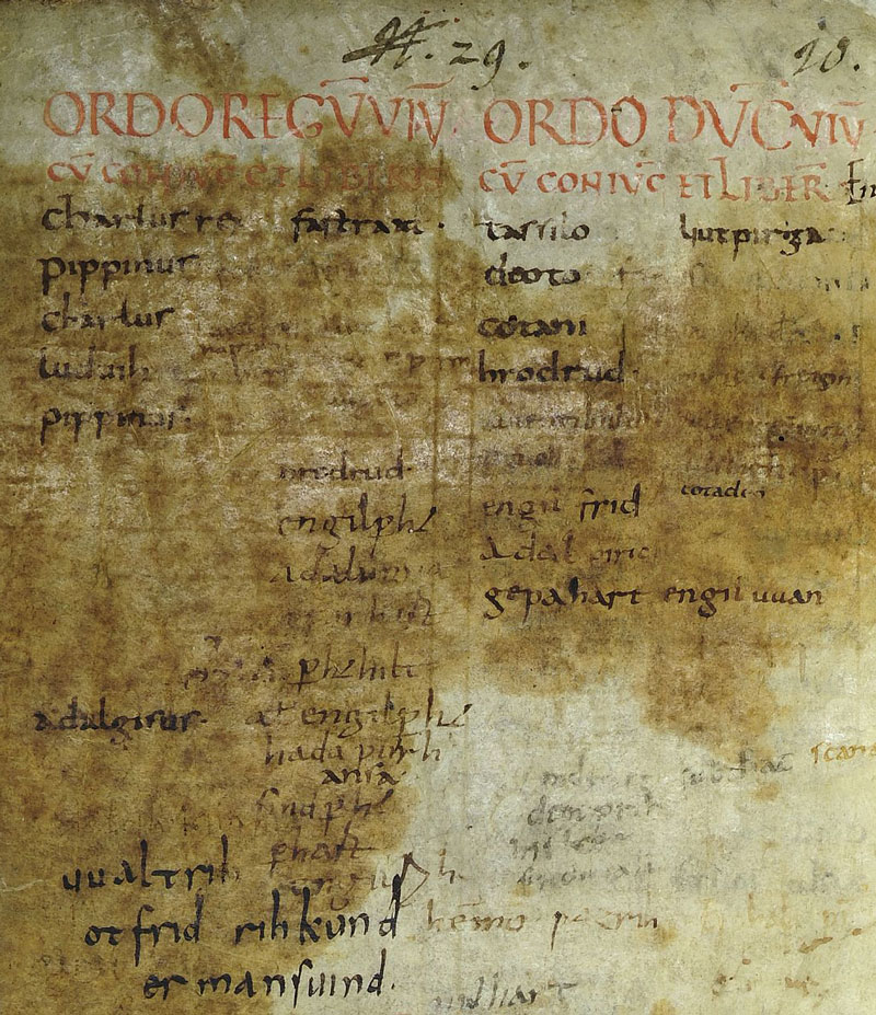 Der Stand der lebenden [fränkischen] Könige und [bayerischen] Herzöge mit ihren Frauen und Kindern im älteren Salzburger Verbrüderungsbuch von 784, ASP, Hs. A 1, p. 10, Spalte 1 und 2 (Ausschnitt). (© Salzburg, Erzabtei St. Peter, Benediktinerstift, Archiv via Manuscripta.at) HLB