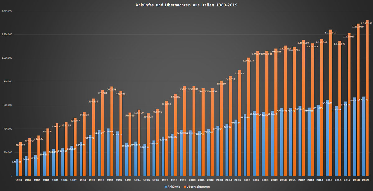 Statistik der Ankünfte und Übernachten aus Italien 1980-2019. HLB