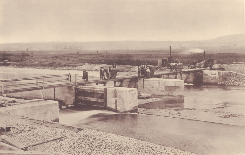 Stauanlage im Main bei Bischberg mit Kammerschleuse, Floßgasse und linksseitiger Wehröffnung, errichtet 1890-1892. Abb. aus: Bauwerke der Staats-Bau-Verwaltung in Bayern auf dem Gebiete des Straßen-, Brücken- und Wasser-Baues, München 1892, 21. (Bayerische Staatsbibliothek, 4 Don.Reg. 4 x) HLB