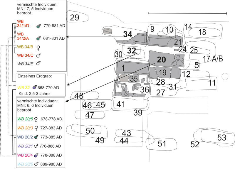 Wielenbach, Lkr. WM, frühmittelalterliches Gräberfeld mit beprobten Bestattungen (nach J. Haberstroh, M. Harbeck, A. Rott, U. Scholz, K. von Heyking) HLB