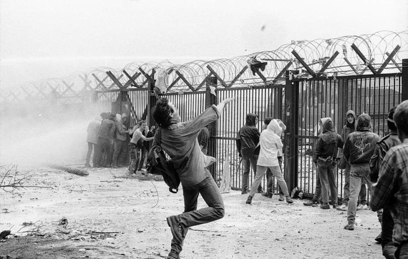Ein Demonstrant wirft einen Stein in Richtung Maschinencamp. (Pfingsten 1986, Fotografie: Gerhard Götz)