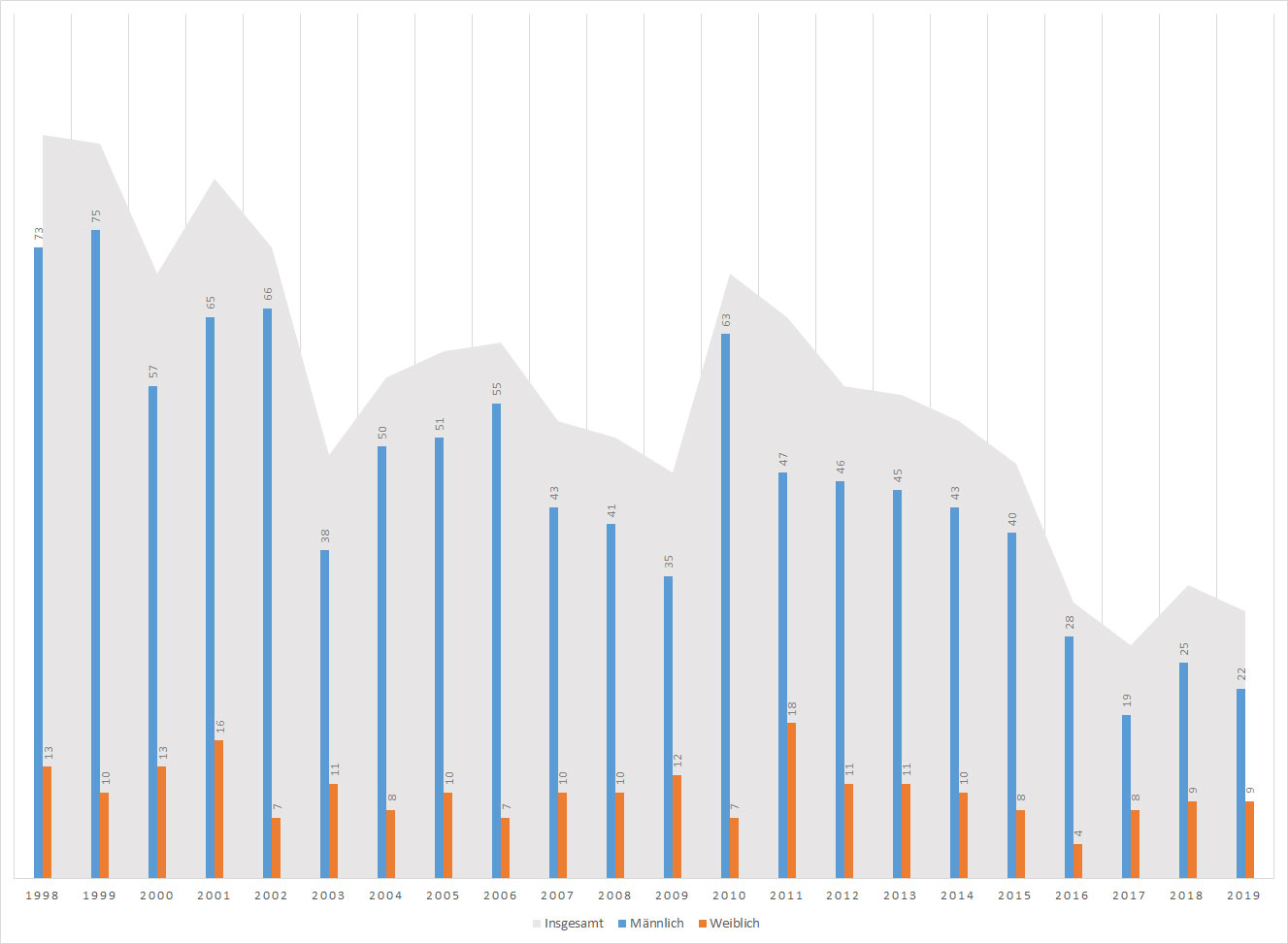 Entwicklung der Todesfälle infolge von HIV in Bayern seit 1980. (Datenbasis: Statistisches Jahrbuch für Bayern) HLB