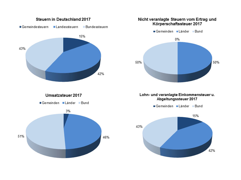 Gemeinschaftliche Steuern in Deutschland: Bund, Länder und Gemeinden 2017. Zahlen nach: Statistisches Bundesamt, Statistik über das Steueraufkommen 2017. (Grafik: Bernhard v. Zech-Kleber)