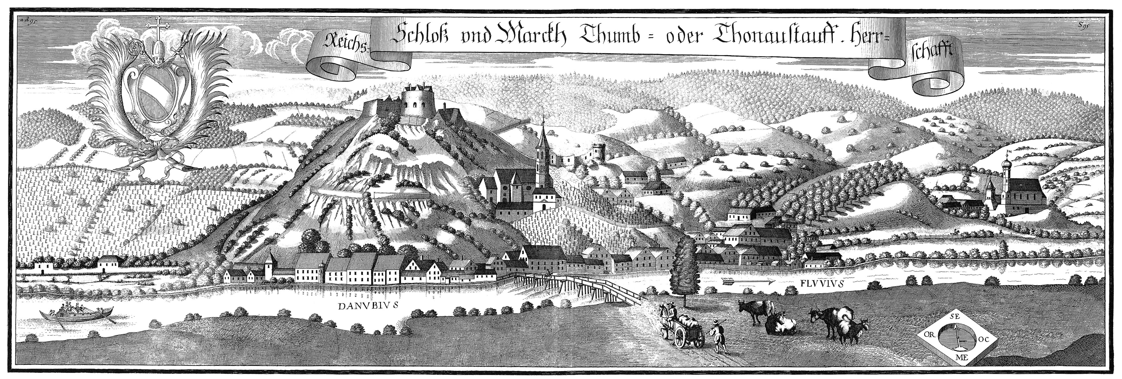 „Reichs-Schloß und Marckh Thumb- oder Thonaustauffische Herrschafft.“ Stich von Michael Wening. (Wening-Stich, S95 Donaustauf, Schloss und Markt, Bayerische Vermessungsverwaltung 2016)