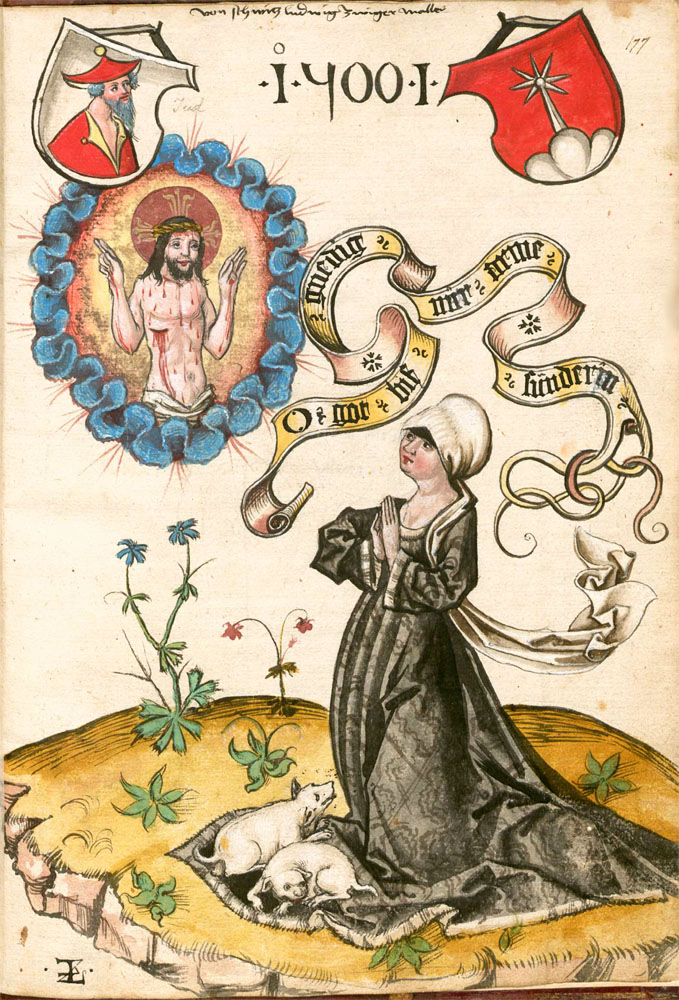 Stifterbild aus der Seybolt- Handschrift, aus dem Jahre 1501 mit den Wappen der Jud (Draufsicht links) und Radlkofer. (Bayerische Staatsbibliothek, Cgm. 331, fol. 177r)