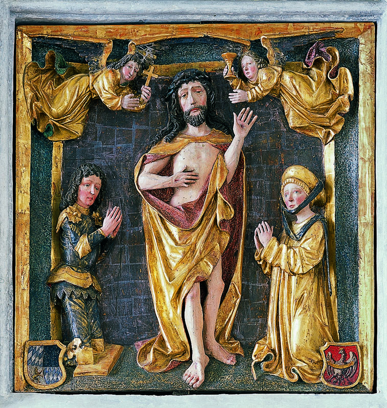 {{|1=Stifterrelief aus Lindenholz an der Westempore in der Äußeren Burgkapellle, der sog. Hedwigskapelle, in der Burg zu Burghausen: Christus als Schmerzensmann mit Herzog Georg dem Reichen (reg 1479–1503) und Hedwig von Polen (1457-1502), entstanden um 1489. (© Bayerische Schlösserverwaltung, Rainer Herrmann/Ulrich Pfeuffer, München)}}