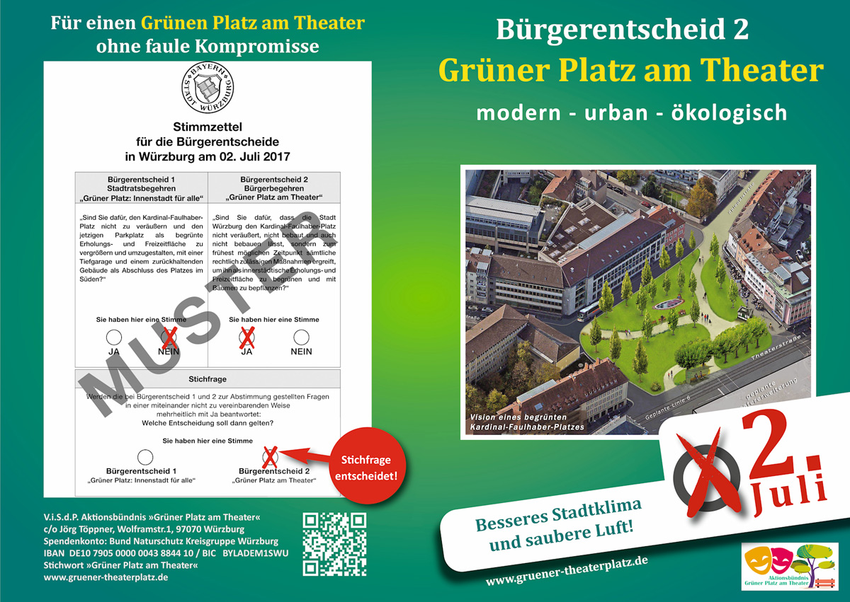 Informationsblatt mit Musterstimmzettel für das Bürgerbegehren "Grüner Platz am Theater" in Würzburg. Das Aktionsbündnis setzt sich durch und entscheidet das Bürgerbegehren 2017 mit 58,4 Prozent für sich. (Aktionsbündnis Grüner Platz am Theater) HLB
