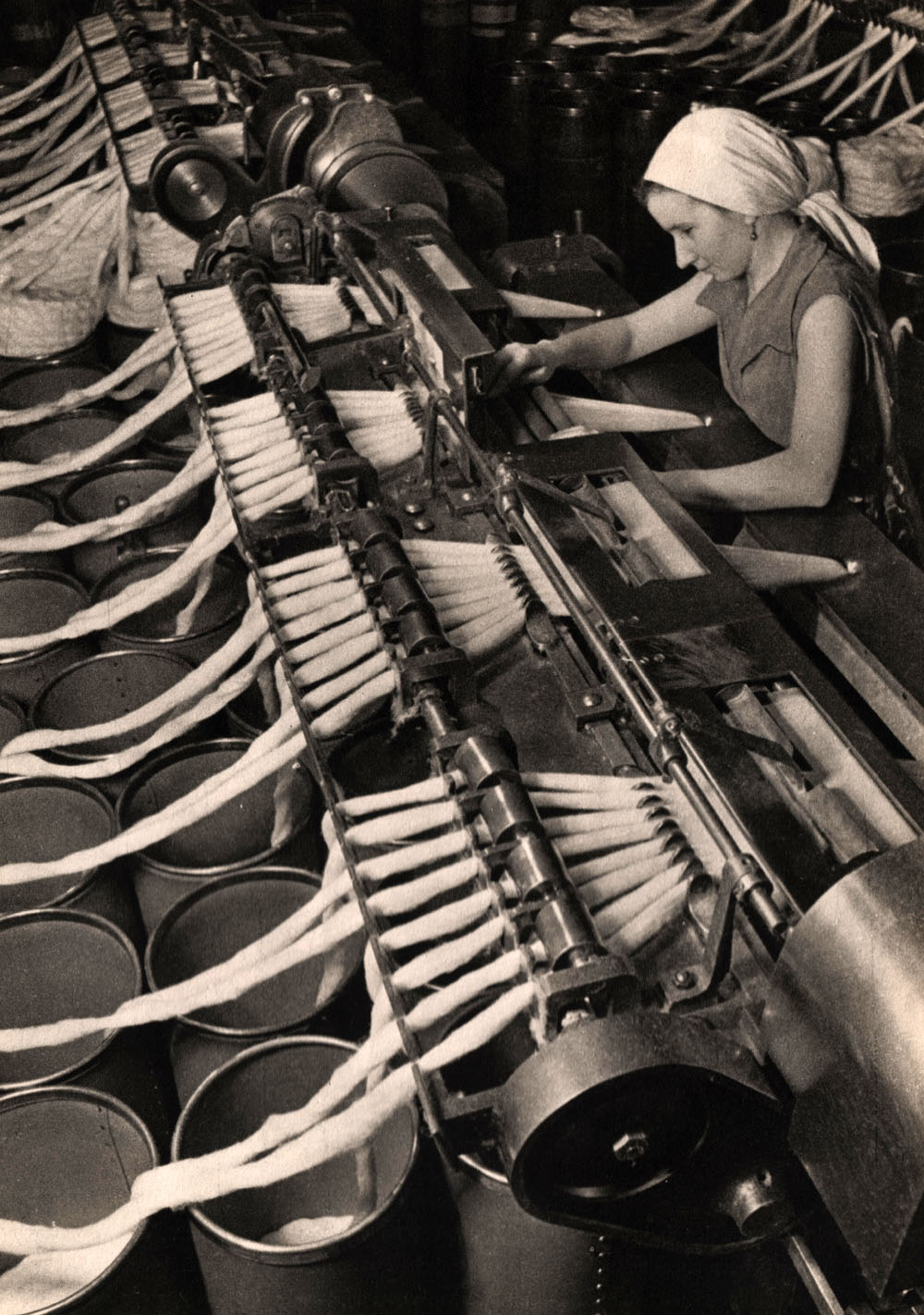 Die mit Faserlunten gfüllten Kannen gelangen anschließend zum Strecken: Je acht Lunten werden zusammengefasst (gedoppelt) und zwischen Walzenpaaren gestreckt (verzogen), wodurch eine einzige Lunte entsteht. (aus: Hundert Jahre Mechanische Baumwollspinnerei und Weberei Augsburg, München 1937, S. 225)