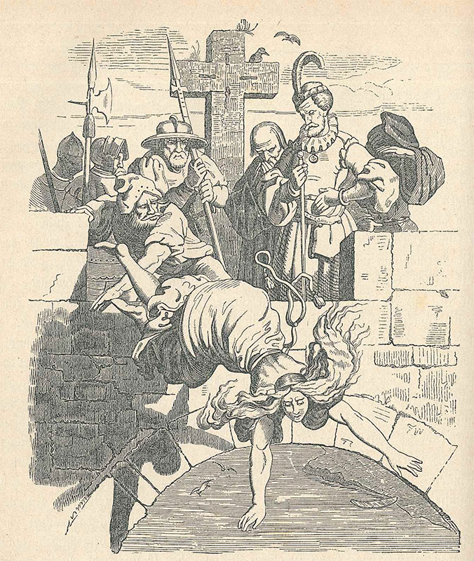 Sturz der Agnes Bernauer in die Donau. Illustration von 1880. (Abb. aus: Joseph Maria Mayer, Das Regentenhaus Wittelsbach, oder: Geschichte Bayerns, Regensburg 1880, 334)