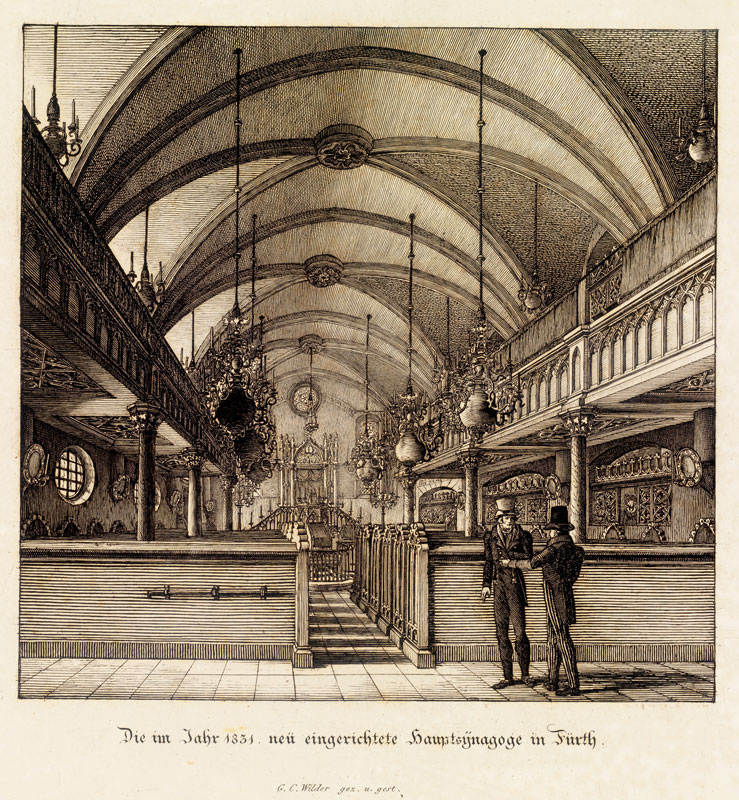 Innenraum der neuen Hauptsynagoge in Fürth, Stich von Georg Christoph Wilder (1797-1855). (Staatsbibliothek Bamberg V C 53, lizenziert durch CC BY-SA 4.0) HLB