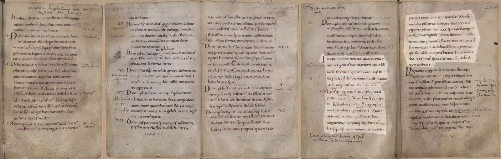 Decreta Tassilonis und Gebetsverbrüderung (hervorgehoben) aus einer Freisinger Handschrift der Lex Baiwariorum aus der Zeit um 820/30. (Bayerische Staatsbibliothek, Clm 19415, 223-227) HLB