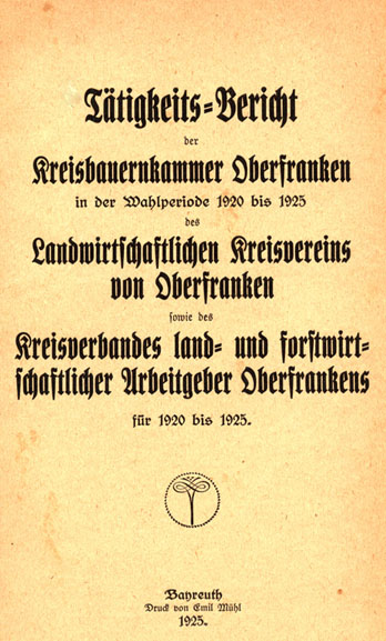 Titelblatt des Tätigkeitsberichts der Kreisbauernkammer Oberfranken in der Wahlperiode 1920 bis 1925 des landwirtschaftlichen Kreisvereins von Oberfranken sowie des Kreisverbandes Land- und Forstwirtschaftliche Arbeitgeber Oberfrankens für 1920 bis 1925, Bayreuth 1925).