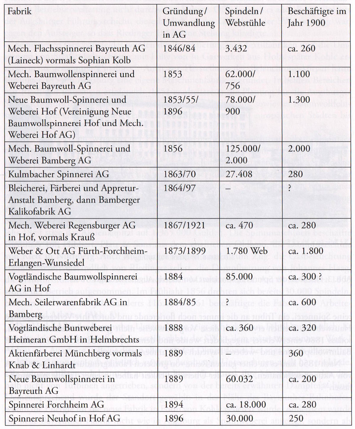 Bedeutende vor 1900 in Oberfranken gegründete Textilfabriken. (Tabelle von Richard Loibl aus: Loibl, Richard: "Kammgarn-, Woll- und Baumwollschals..." - Textilherstellung in der Industrieregion Oberfranken im 19. Jahrhundert, in: Murr, Karl Borromäus u. a.: Die süddeutsche Textillandschaft, Augsburg 2010, S. 78)