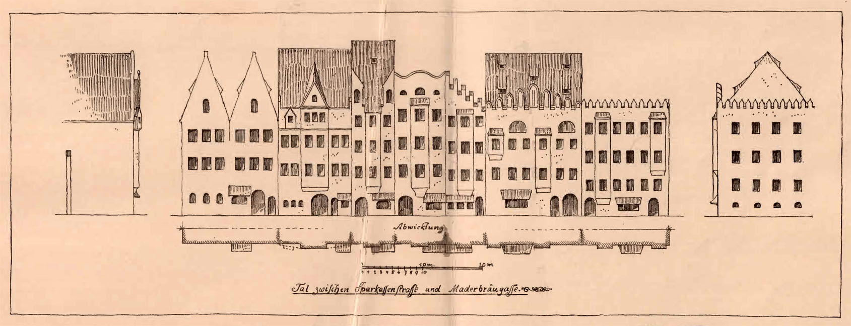 Die Häuser im Tal zwischen Sparkassenstraße und Maderbräugasse in München. (aus: Steinlein, Gustav: Die Baukunst Alt-Münchens, München ca. 1917, Tafel III)