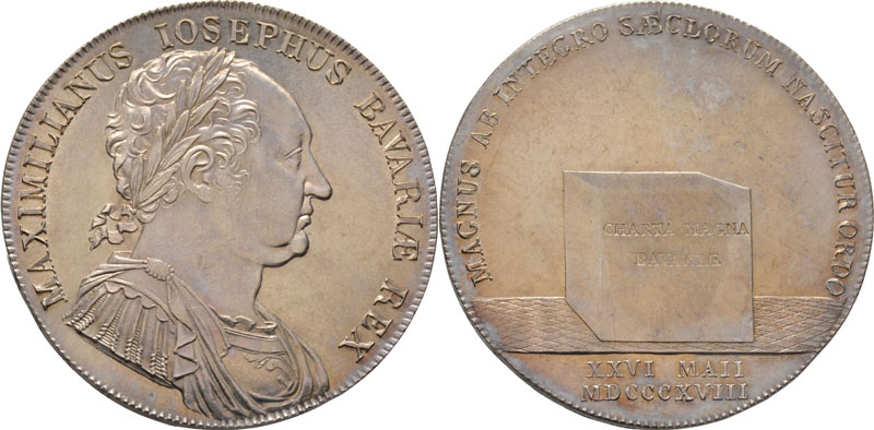 Taler König Max I. Josephs (1756-1825, reg. 1799-1825) auf die bayerische Verfassung von 1818, München, 1818, Staatliche Münzsammlung München, 6-07069. (Lena Nitzer, Staatliche Münzsammlung München, 2016 lizenziert durch CC BY-NC-SA 4.0) HLB