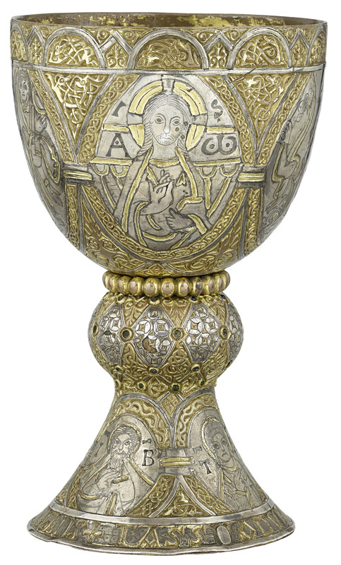 Der Tassilo-Liutpirc-Kelch (2. Hälfte 8. Jh.). Ansicht mit Christus-Medaillon. Direkt darunter steht der Name Tassilos in der Inschrift auf dem Fuß. (Fotograf: Volker Iserhardt, Römisch-Germanisches Zentralmuseum Mainz) HLB