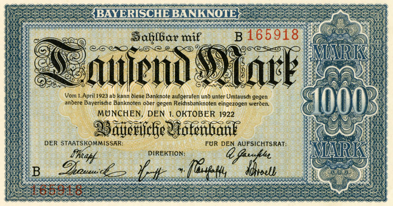 Banknote der Bayerischen Notenbank über 1000 Mark, 1922. (Bayerisches Wirtschaftsarchiv, F118, 1194) HLB