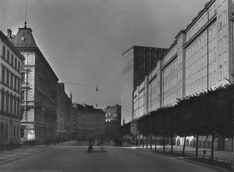 Gebäudekomplex des Technischen Rathauses in München (rechts im Bild) mit dem markanten Hochhaus. Architekt Hermann Leitenstorfer (1886-1972), erbaut 1924 bis 1929. (Stadtarchiv München, DE-1992-FS-HB-V-b-1530) HLB