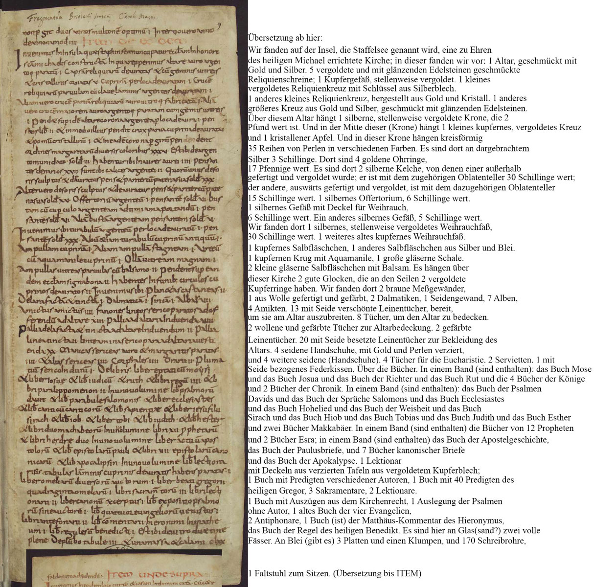 Beschreibung und Übersetzung des Inventars der zum Kloster Staffelsee gehörenden Michaelskirche. Abb. aus: Brevium Exempla, nach 800, fol. 9r-v. Übersetzung aus: Ludolf Kuchenbuch, Grundherrschaft im frühen Mittelalter (Historisches Seminar, Neue Folge 1), Idstein 1991, 113f. (angepasst). (Herzog August Bibliothek Wolfenbüttel, Cod. Guelf. 254 Helmst. lizenziert durch CC BY-SA 3.0) HLB
