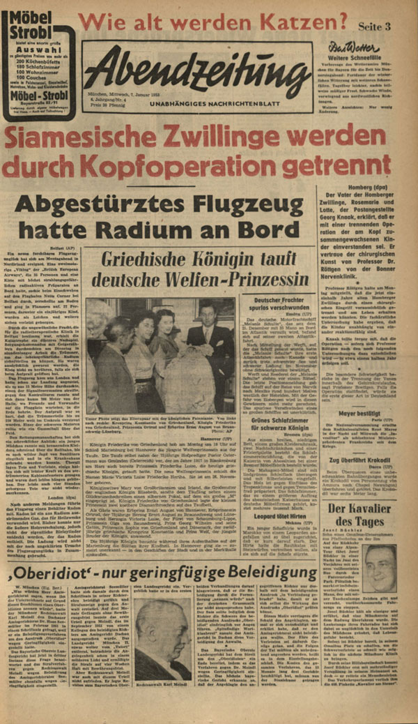 Titelblatt der Abendzeitung vom 7.1.1953. (AZ) HLB