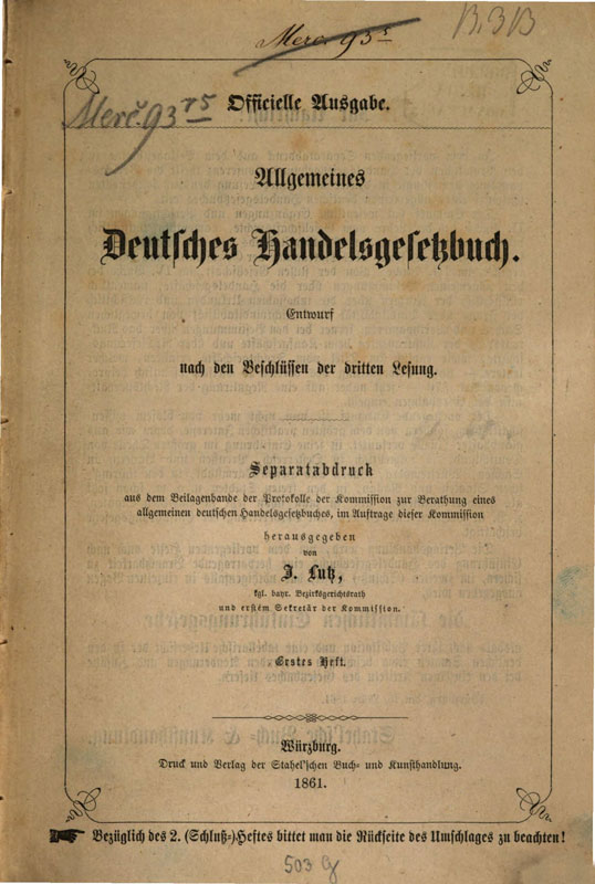 Titelblatt: Allgemeines Deutsches Handelsgesetzbuch. Entwurf nach den Beschlüssen der dritten Lesung. Erstes Heft, Würzburg 1861. (Bayerische Staatsbibliothek, Merc. 93 rs-1) HLB