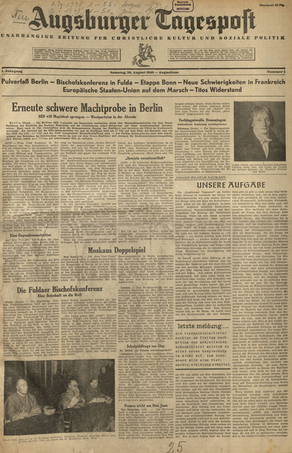 Titelblatt der ersten Ausgabe der Tagepost vom 28.8.1948, die damals noch unter dem Titel "Augsburger Tagespsot" erschien. (Die Tagespost) HLB