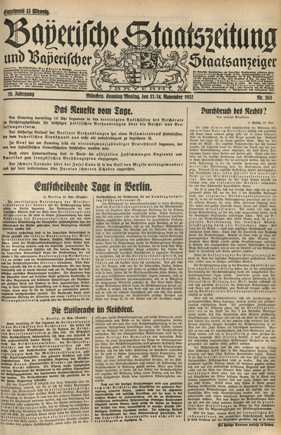 Titelblatt der Bayerischen Staatszeitung vom 13. und 14.11.1932. (Bayerische Staatszeitung) HLB
