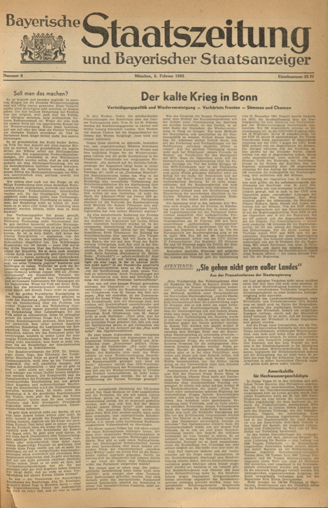 Titelblatt der Bayerischen Staatszeitung vom 5.2.1955. (Bayerische Staatszeitung) HLB