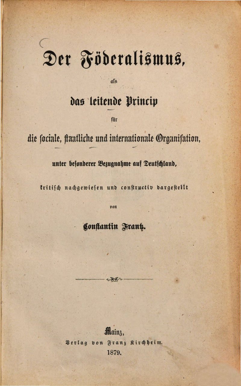 Titelblatt: Constantin Frantz, Der Föderalismus, als das leitende Princip für die sociale, staatliche und internationale Organisation, Mainz 1879. (Bayerische Staatsbibliothek, Pol.g. 327 ti) HLB