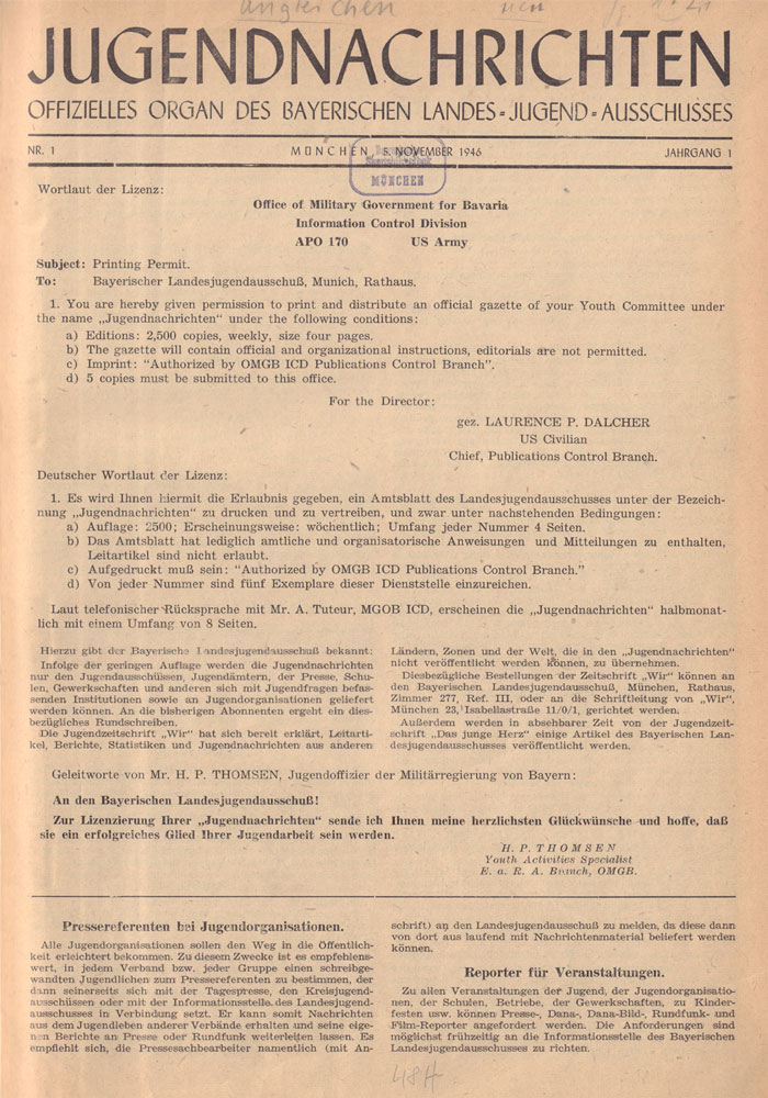 Titelblatt der ersten Ausgabe der Zeitschrift "Jugendnachrichten", dem offiziellen Organ des Bayerischen Jugend-Ausschusses vom 5. November 1946. (Bayerische Staatsbibliothek 4 Z 53.175-1/2,1, mit Genehmigung des Bayerischen Jugendrings)
