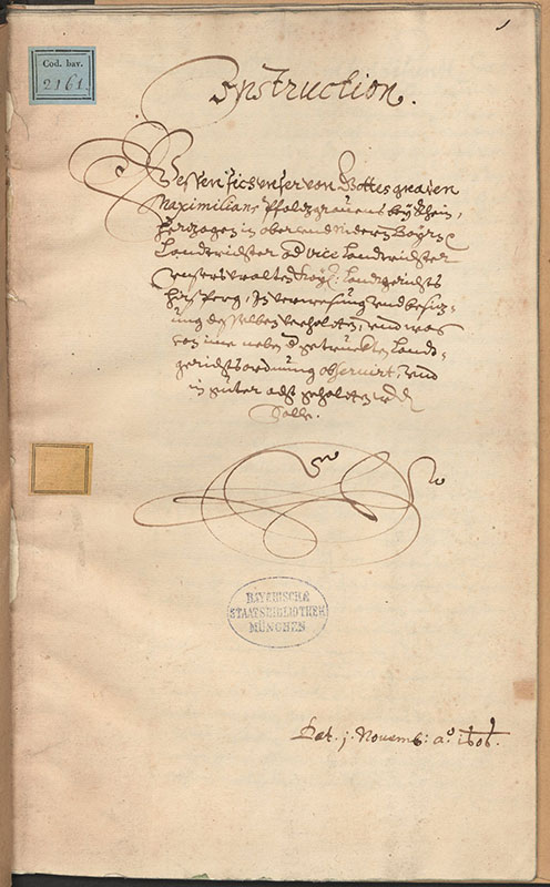 Titelblatt der Instruktion der Instruktion Herzog Maximilians I. von Bayern (reg. 1597-1651) für die kaiserlichen Landrichter oder Vizelandrichter zu Hirschberg (Bayerische Staatsbibliothek Cgm 2161).