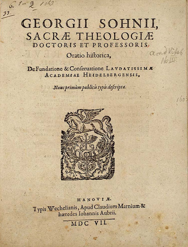 Titelseite der "Oratio historica: De Fundatione & Conservatione Laudatissimae Academiae Heidelbergensis" von Georg Sohn (1551-1589). (Universitäts- und Landesbibliothek Sachsen Anhalt, Gb 1166 (1)