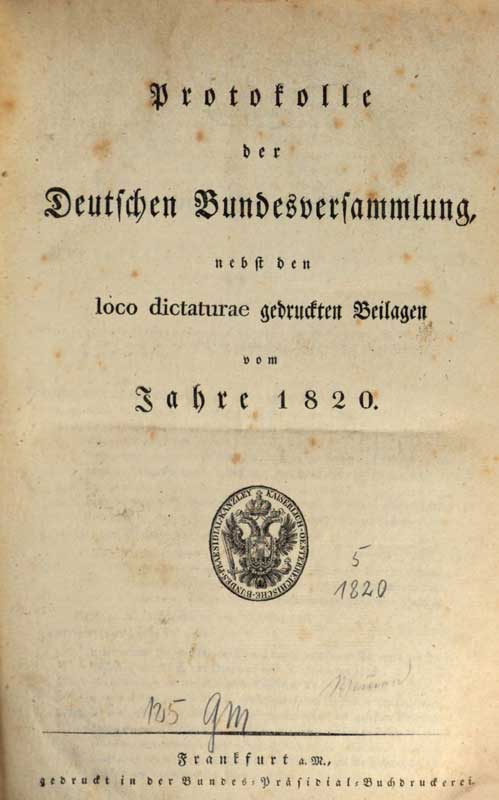 Titelblatt der Protokolle der Deutschen Bundesversammlung nebst den loco dictaturae gedruckten Beilagen vom Jahre 1820, Frankfurt a.M., 1820. (Bayerische Staatsbibliothek, 2 J.publ.g. 339 e-5) HLB
